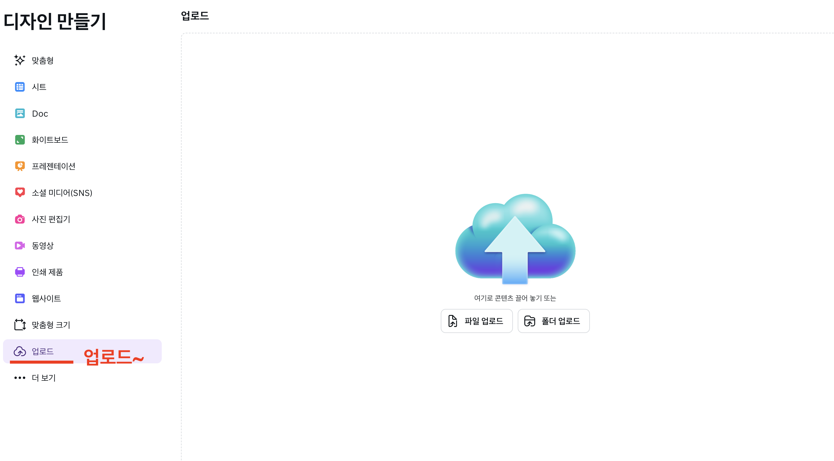 상단 메뉴에서 ‘디자인 만들기’ 버튼 클릭 → ‘내 기기에서 업로드’ 선택 후 수정하고 싶은 PDF 파일을 선택합니다.